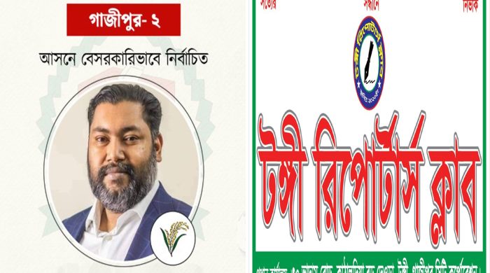 গাজীপুর-২ আসনে বিপুল ভোটে এম মঞ্জুরুল করিম রনি নির্বাচিত হওয়ায় টঙ্গী রিপোর্টার্স ক্লাবের পক্ষ থেকে অভিনন্দন